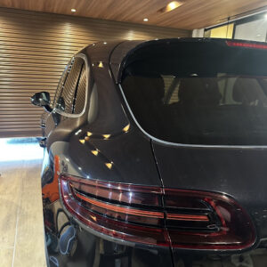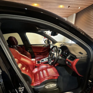 ポルシェ マカンの車内クリーニング。 赤革シートが黒ずんできたとのことで入庫いただきました。色落ちを防ぎながら汚れのみを慎重に除去し、革本来の美しさを蘇らせます。高級車の繊細な内装も安心してお任せください。
